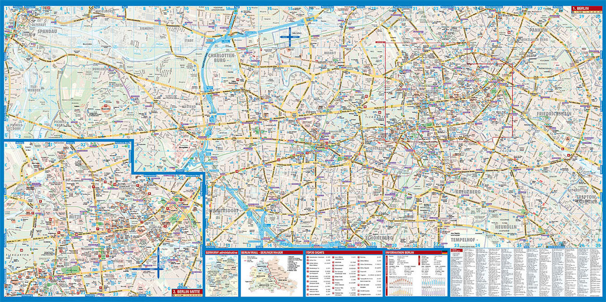 En utvidgning på 1:11 500 presenterar Mitte, stadens historiska centrum, mer detaljerat. Täckningen omfattar den nya centralstationen, kanslihuset och riksdagen, kulturforumkomplexet med museer och konserthus, Checkpoint Charlie och Alexander Platz. Båda planerna visar U-Bahn- och S-Bahn-stationerna, spårvagnslinjer med hållplatser, enkelriktade gator och parkeringar, utvalda boenden, intressanta platser etc. En lista över de 30 bästa sevärdheterna visar stadens främsta sevärdheter, alla markerade på planerna.