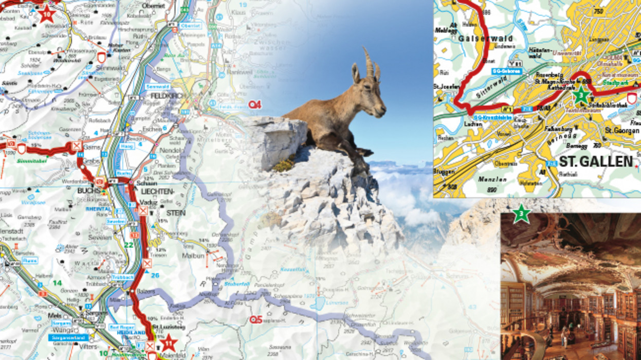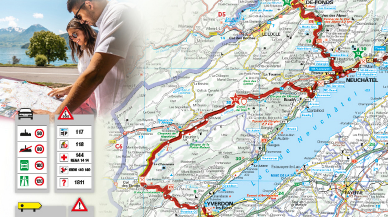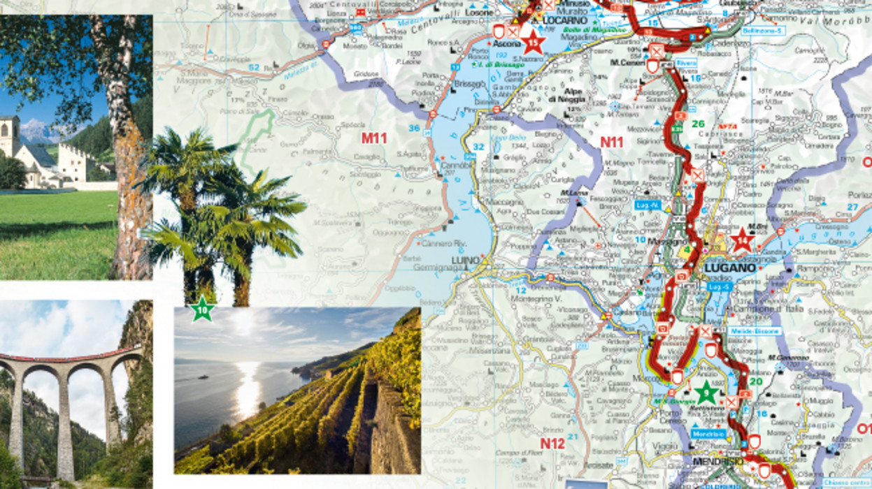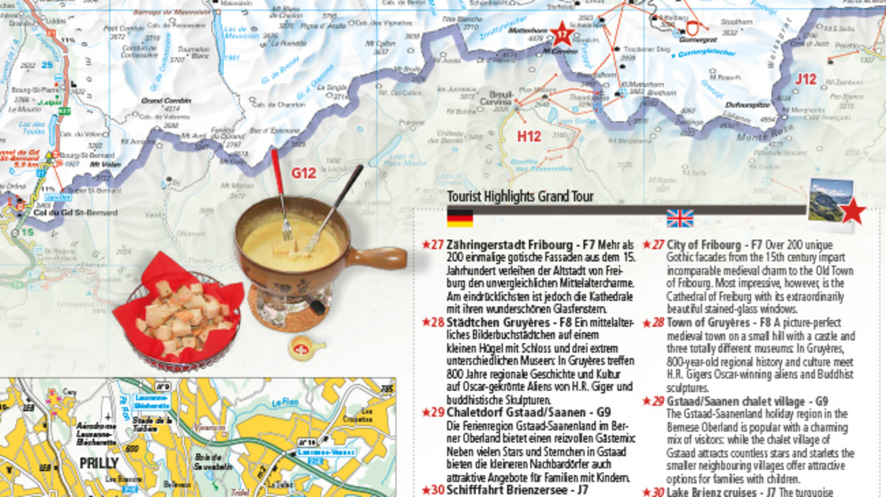 Denna karta, som är i skala 1:275 000 och laminerad, är lika speciell som själva ”Grand Tour of Switzerland”. 44 höjdpunkter längs den 1 600 km långa rutten och de vackraste ruttavsnitten är speciellt markerade. Kartan är en liten reseledare i sig! Foton och beskrivningar på fyra språk (tyska, franska, italienska och engelska) kompletterar den kartografiska informationen. Det är perfekt för att förhandsgranska och minnas de många attraktionerna längs den minnesvärda ”Grand Tour of Switzerland”.