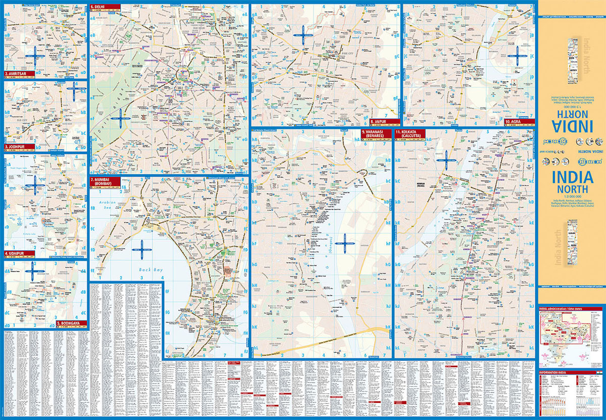 Baksidan tas av 10 paneler med gatuplaner vid 1:30 000 som visar centrala distrikt i Amritsar, Jodhpur, Udaipur, Bodhgaya, Delhi, Mumbai, Jaipur, Varanasi (Benares), Agra och Kolkata (Calcutta). Planerna lyfter fram främsta sevärdheter, utvalda hotell, olika institutioner och är indexerade. Kartan ger också en liten karta över Indiens administrativa indelningar och tidszoner, samt information om klimatet.