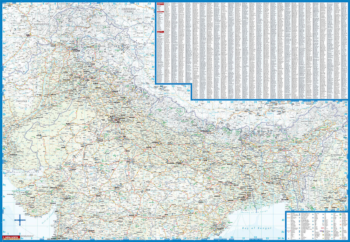 Norra Indien, inklusive hela Nepal, Bhutan och Bangladesh, på 1:3 000 000 på en laminerad, vattentät och rivsäker, indexerad färdkarta från Borch, med stora indexerade gatuplaner för dess tio huvudstäder.