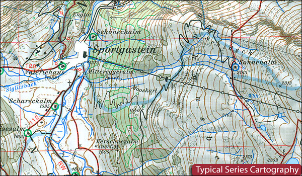 Kartor i den här serien har topografi som livfullt presenteras av konturer med 20 meters intervall, förstärkta av skuggning och fint ritade grafiska reliefer. Ett övertryck framhäver vandringsleder och/eller skidleder (se anteckningen nedan), campingplatser och olika typer av fjällstugor och tillflyktsorter. Området som täcks av varje karta varierar beroende på skalan; för 1:25 000 kartor är det ungefär 25×18 km (15 x 11 miles). Kartorna har ett 1-km UTM-rutnät, plus marginaltickar med latitud och longitud med intervaller på 1′. Kartförklaring är endast på tyska.