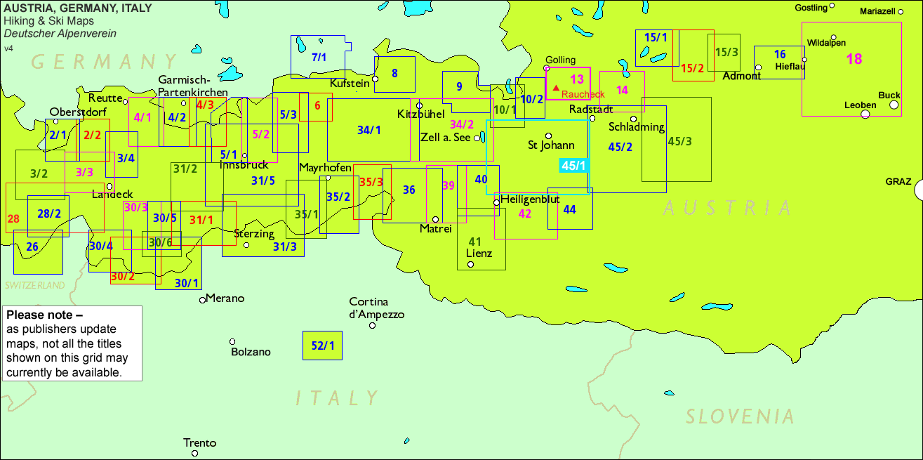 OBSERVERA – ÖVERTRYCKET FÖR VANDRINGS- och/eller SKIDVÄGAR: alla Blad Ref. nummer som visas på det medföljande rutnätet är tillgängliga med ett övertryck som markerar vandringsleder, indikerar sektioner med fasta klätterrep och, i förekommande fall, vägmarkeringsruttnummer. Nu publiceras flera titlar med både vandrings- och skidleder på. Andra områden täcks av två separata kartor: en vandringsutgåva plus en skidupplaga. Typen av övertryck anges i vår titel på varje karta.