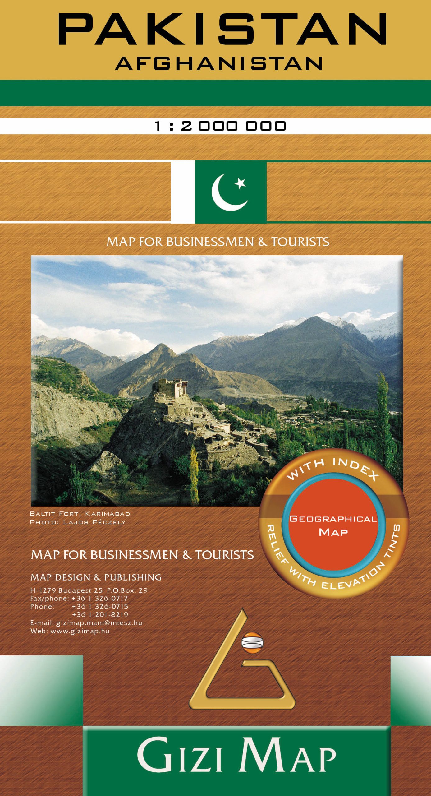 Pakistan och hela Afghanistan i skala 1:2 000 000 från Gizi-karta i höjdfärger som tydligt visar den fysiska geografin för dessa länder och den omgivande regionen, plus turistinformation och administrativ information.