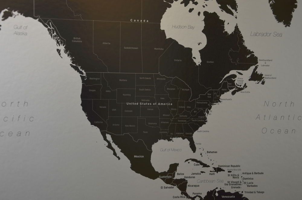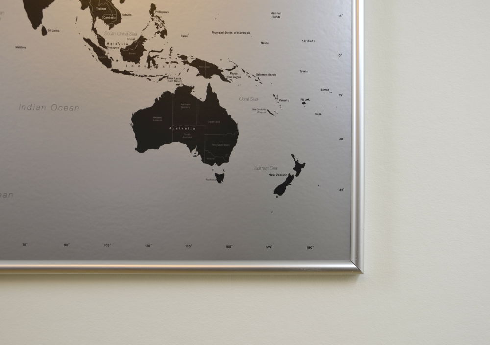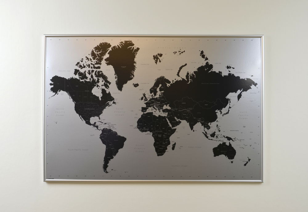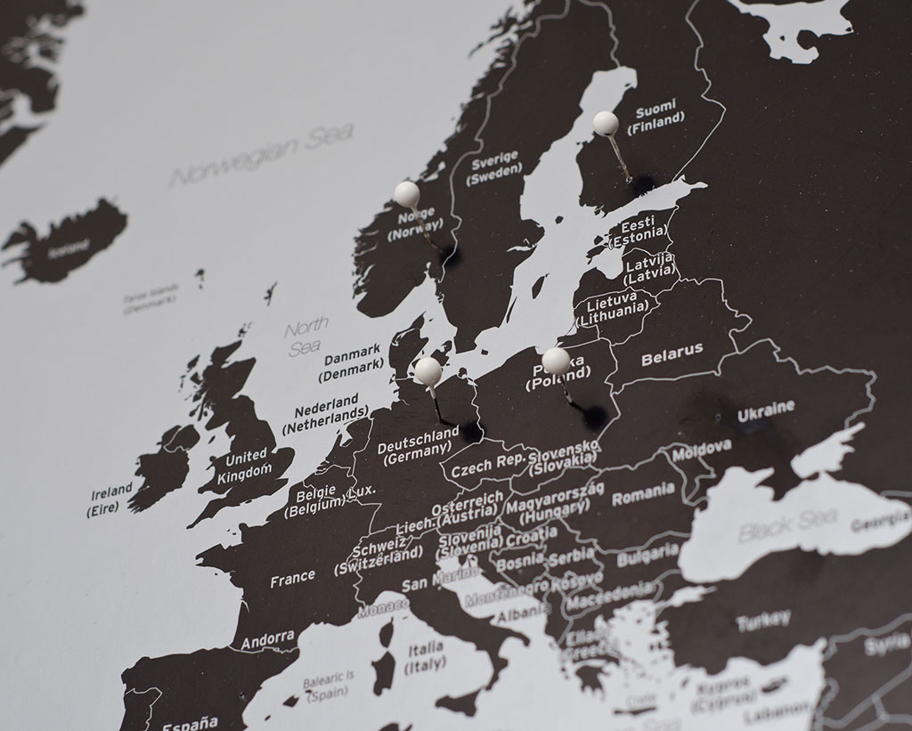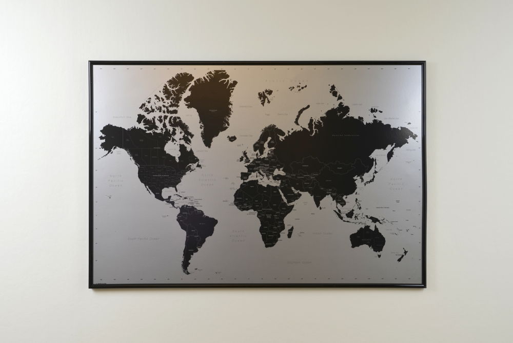 Stor Världskarta Modern i svart och silver där du kan märka ut dom länderna du rest till med nålar. Perfekt för att visa dina vänner vart du varit i världen, eller kanske som en present till någon som gillar att resa? En karttavla som aldrig går ur tiden.