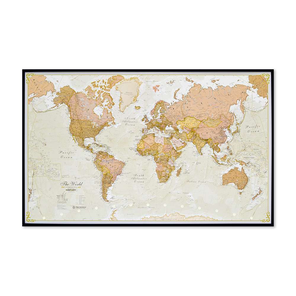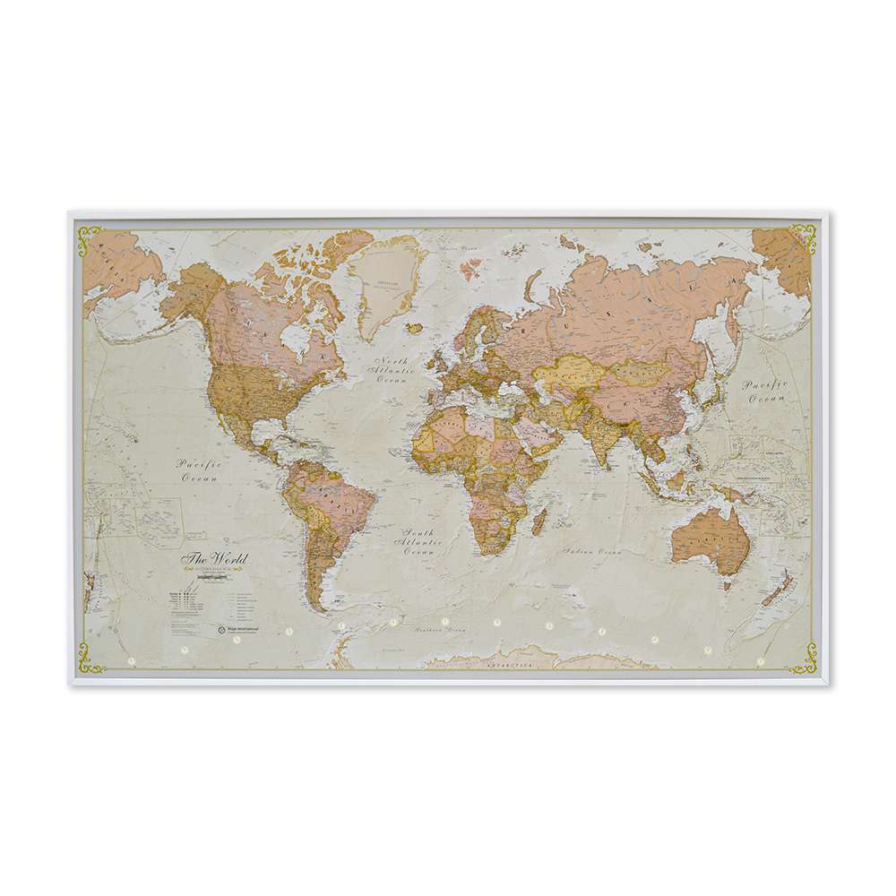 Stor världskarta världen Antik där du kan märka ut länderna du rest till med nålar. Perfekt för att visa dina vänner vart du varit i världen eller som present till någon som gillar att resa. En karttavla som aldrig går ur tiden Fin karta att ha på väggen i hemmet, företaget eller på skolan som en skolkarta.