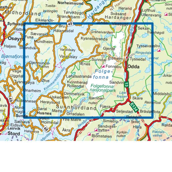 Topo 3000 är en detaljerad karta som täcker mer än 3000 km2. Folgefonna nationalpark ligger på en halvö i Hardangerfjorden och är den tredje största glaciären i Norge. Folgefonna har dramatisk natur med fjordar, berg, isfall och floder med smaragdgrönt smältvatten. Från toppen kan du se stora områden av Hardangervidda. Buarbreen och Bondhusbreen är två populära glaciärer i området.