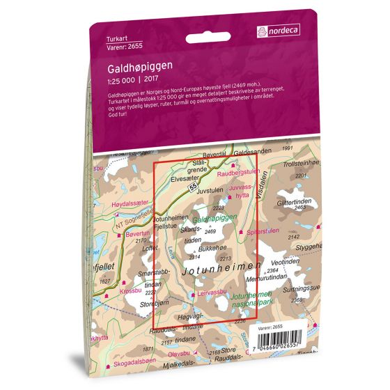 Galdhøpiggen är det högsta berget i Norge och Nordeuropa (2469 möh). Denna 1:25 000 spårkarta ger en mycket detaljerad beskrivning av terrängen och visar tydligt leder, rutter, destinationer och övernattningsmöjligheter i området.