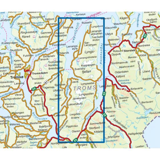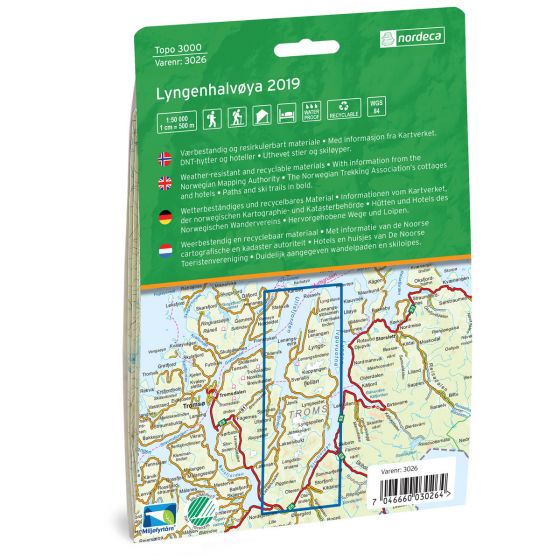 Topo 3000 är en detaljerad karta som täcker över 3000 km2. Mellan Ullsfjorden och Lyngenfjorden ligger Lyngenhalvön, som är känd för sina höga toppar, branta bergssidor och smala dalar. Lyngenhalvön är en bra utgångspunkt för varierande naturupplevelser. Stora delar av halvön är skyddad för bevarande och det finns även en del naturreservat. I Lyngen hittar du många tippboxar i varierad terräng.Här hittar du resor som: Toppskidor till Store Jægervasstinden 6 km, Store Kjostinden, skidåkning 3,8 km, Stelen (lättfärd lämplig för barn / rullstol / barnvagn 1,2 km, Trollhytta 8 km och Jiehkkevarri längs 30 km Exempel på stugor: Fastdalshytta, Sieddihytta och Jægervasshytta (obevakad).